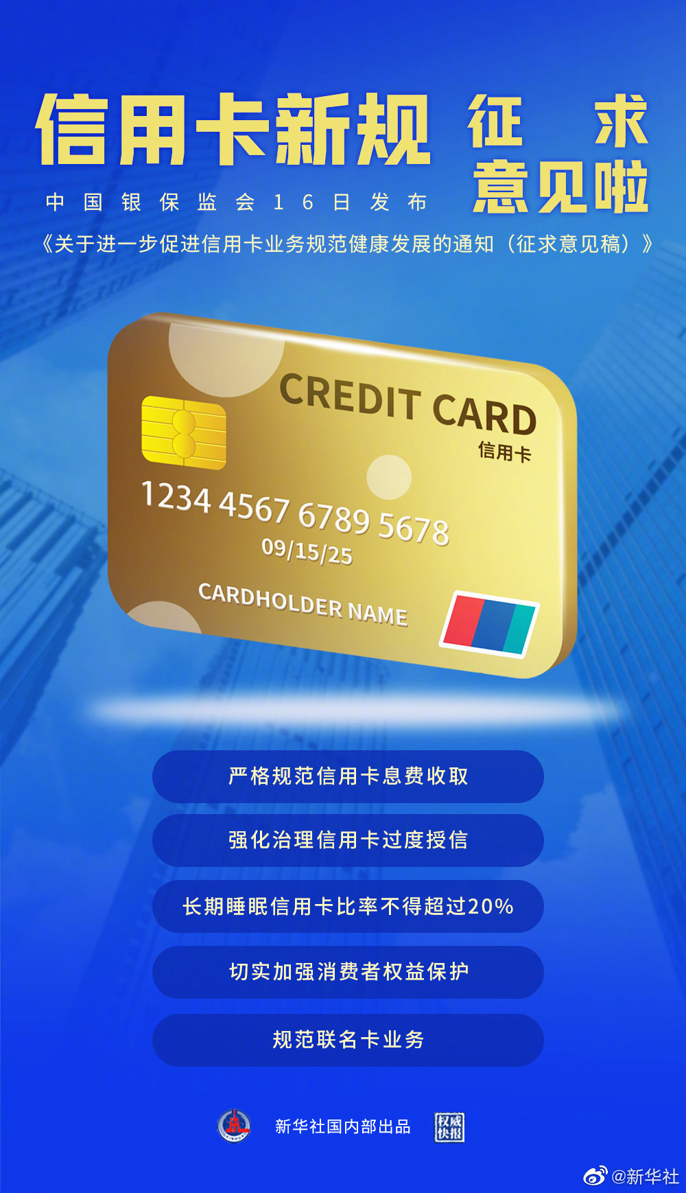 银保监会16日发布《关于进一步促进信用卡业务规范健康发展的通知(征求意见稿)》,抓住信用卡发展中社会高度关注、群众反映集中的问题,制定针对性的监管办法。包括严格规范信用卡息费收取,银行展示分期业务资金使用成本统一采用利息形式;强化治理信用卡过度授信,防范跨行不合理叠加授信;银行长期睡眠信用卡比率不得超过20%等。(记者李延霞,海报设计张晨光)