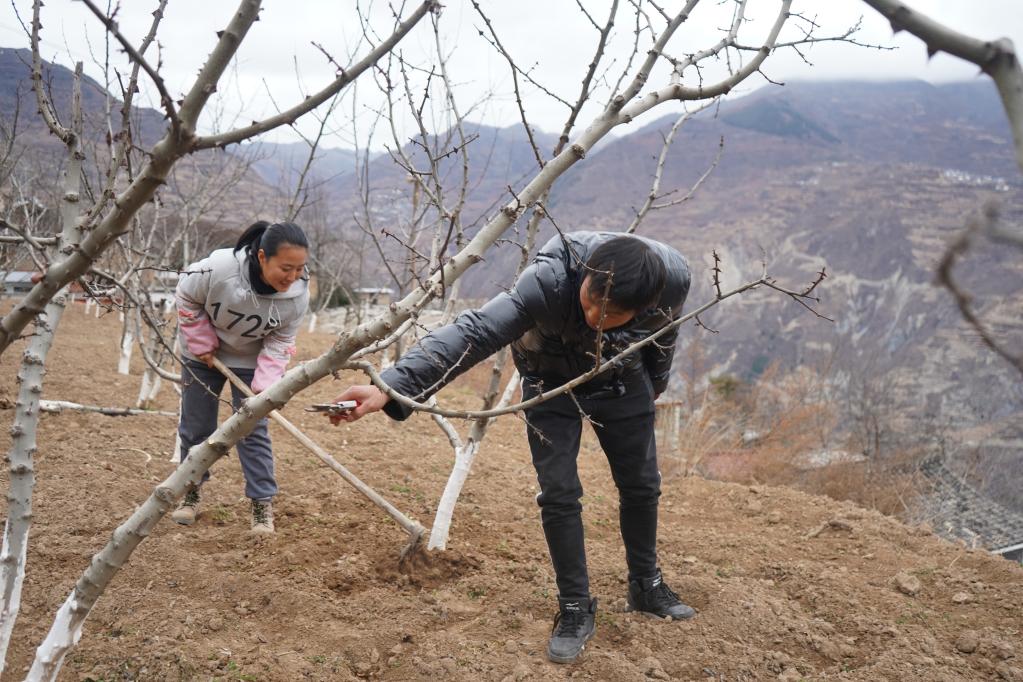 12月7日,郭河乡营寨村村民杨利红和妻子在田间管护花椒树。新华社记者郎兵兵 摄