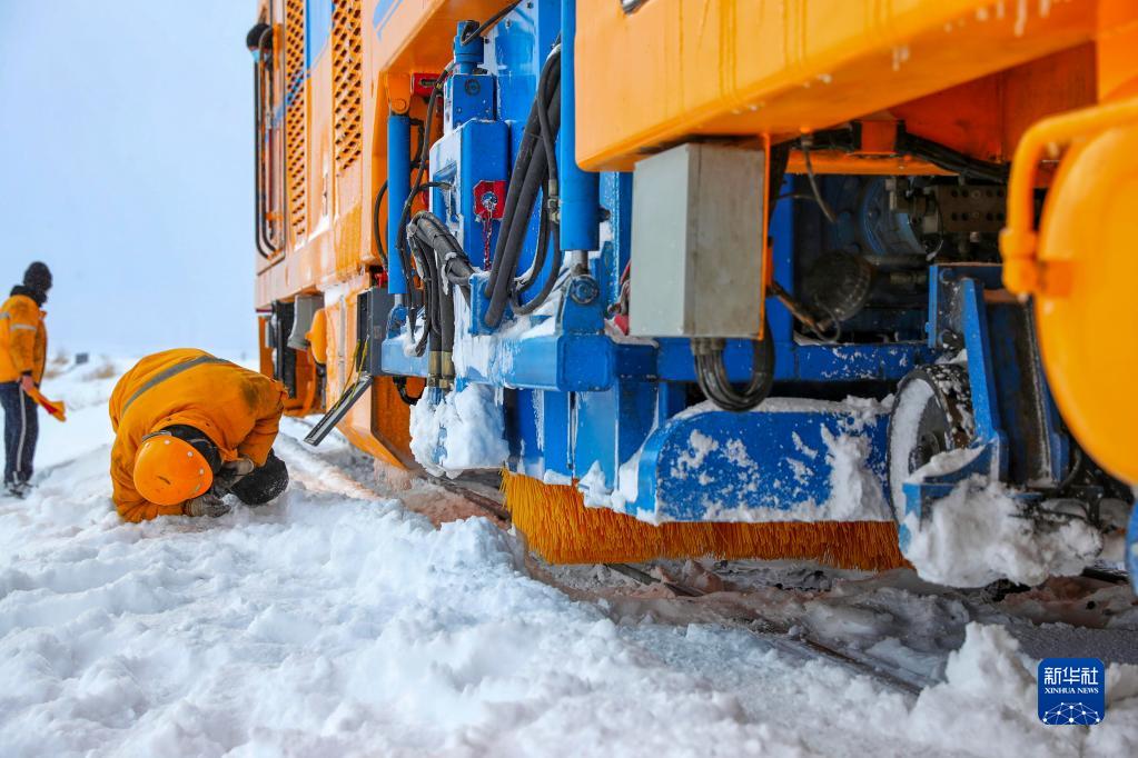 作业人员在检查升级版极寒轨道除雪车滚刷式抛雪机(12月14日摄)。