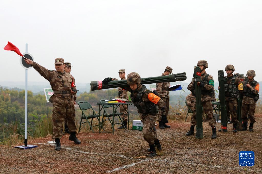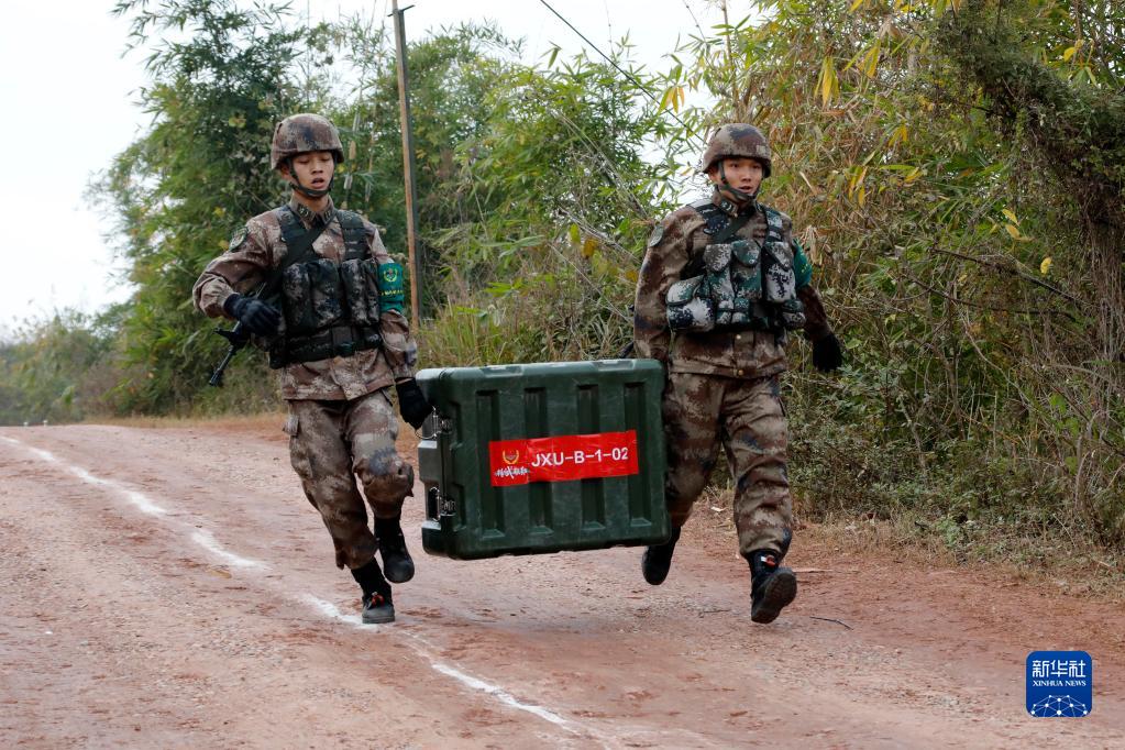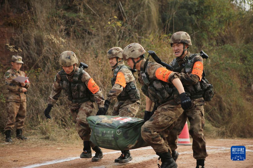 在“精武联勤-2021”战斗体能比武中,参赛队员进行物资交接(12月13日摄)。新华社发(王凯 摄)