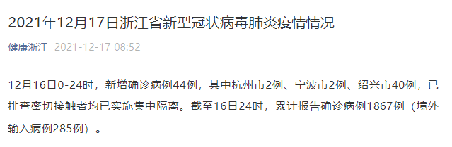 12月16日0-24时,新增确诊病例44例,其中杭州市2例、宁波市2例、绍兴市40例,已排查密切接触者均已实施集中隔离。截至16日24时,累计报告确诊病例1867例(境外输入病例285例)。