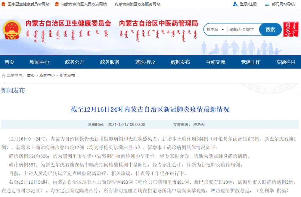 12月16日0—24时,内蒙古自治区报告无新增疑似病例和无症状感染者,新增本土确诊病例4例(呼伦贝尔满洲里市3例、新巴尔虎右旗1例)。新增本土确诊病例治愈出院12例(均为呼伦贝尔满洲里市)。新增本土确诊病例具体情况如下: