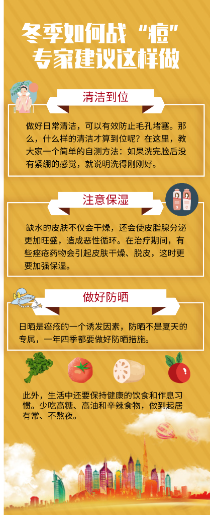 在寒冷的冬季,如何养成一张干净脸?晋红中建议,首先要清洁到位。做好日常清洁,可以有效防止毛孔堵塞。青少年可选择较为温和的弱酸性产品,每日早晚洁面两次。其次,注意保湿。缺水的皮肤不仅会干燥,还会使皮脂腺分泌更加旺盛,造成恶性循环。在治疗期间,有些痤疮药物会引起皮肤干燥、脱皮,这时更要加强保湿。最后,做好防晒。日晒是痤疮的一个诱发因素,防晒不是夏天的专属,一年四季都要做好防晒措施。