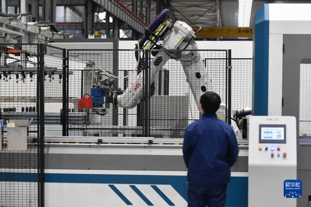 12月17日,工人在位于杭州市临平区的西奥电梯数字工厂内的自动化智能生产线前工作。