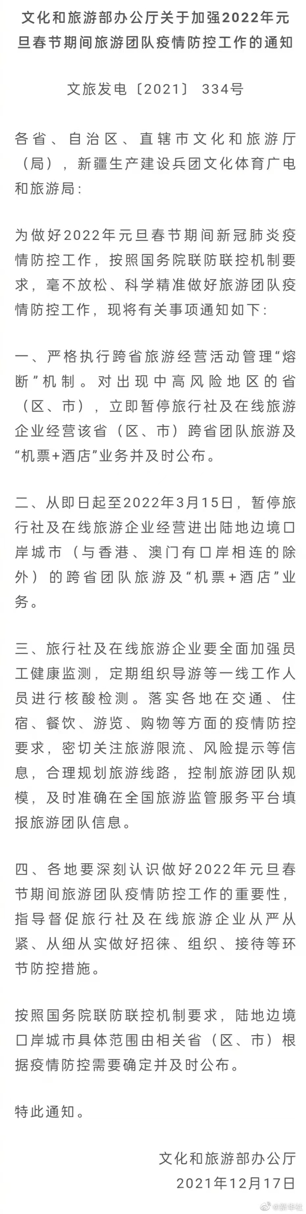 文化和旅游部17日发布通知,要求加强2022年元旦春节期间旅游团队疫情防控工作。通知要求,严格执行跨省旅游经营活动管理“熔断”机制。对出现中高风险地区的省(区、市),立即暂停旅行社及在线旅游企业经营该省(区、市)跨省团队旅游及“机票+酒店”业务并及时公布。从即日起至2022年3月15日,暂停旅行社及在线旅游企业经营进出陆地边境口岸城市(与香港、澳门有口岸相连的除外)的跨省团队旅游及“机票+酒店”业务。(记者余俊杰)