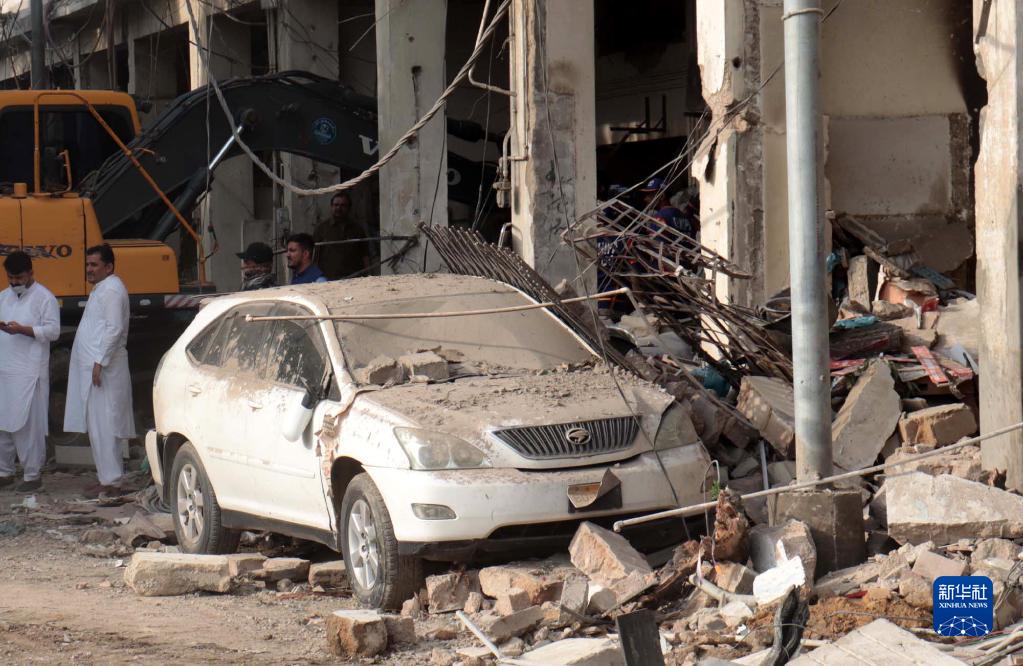 这是12月18日在巴基斯坦卡拉奇拍摄的在爆炸中受损的车辆和建筑。新华社发