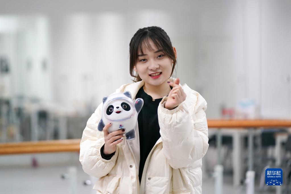 北京邮电大学的学生志愿者姜懿桐拿着北京2022年冬奥会吉祥物冰墩墩比出爱心手势(12月15日摄)。