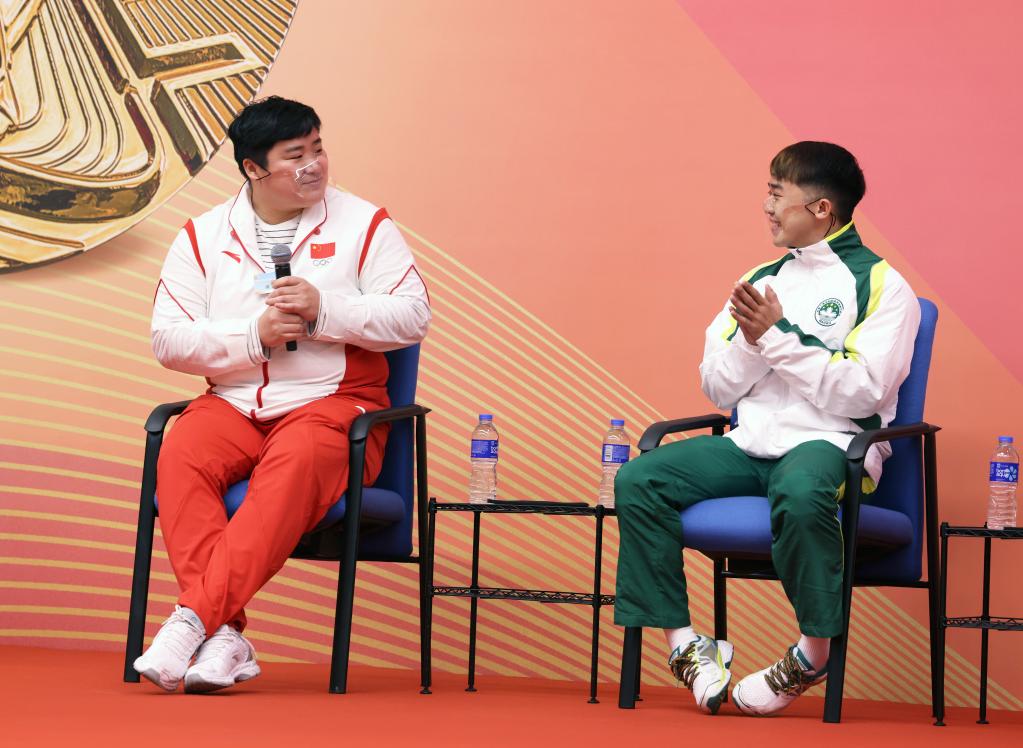 12月20日,内地奥运健儿代表团成员巩立姣(左)与澳门空手道运动员郭建恒在活动上交流。新华社记者贾浩成摄