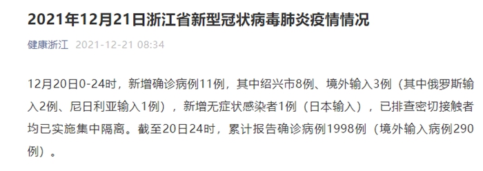 12月20日0-24时,浙江新增确诊病例11例,其中绍兴市8例、境外输入3例(其中俄罗斯输入2例、尼日利亚输入1例),新增无症状感染者1例(日本输入),已排查密切接触者均已实施集中隔离。截至20日24时,累计报告确诊病例1998例(境外输入病例290例)。