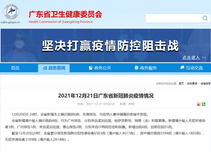 12月20日0-24时,全省新增本土确诊病例6例,东莞报告,均在纳入集中隔离的密接中发现。