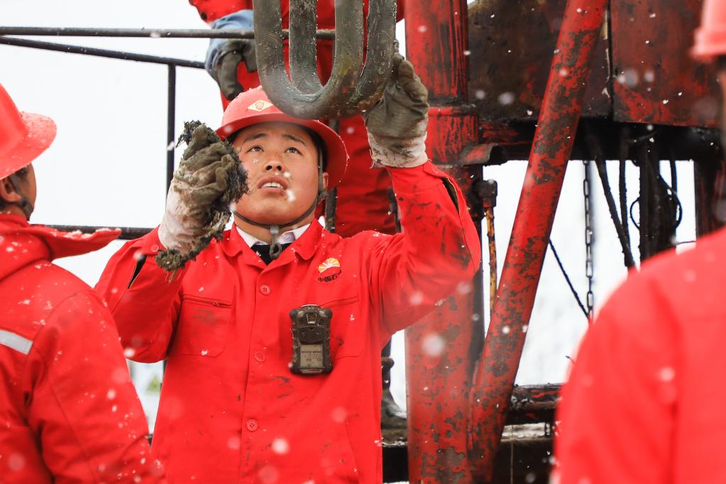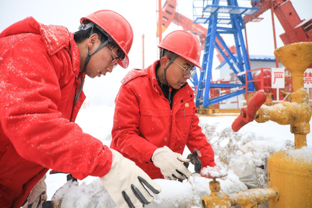 陇东黄土塬上,风裹着雪。在南梁革命根据地所在的华池县,长庆油田陇东页岩油项目部华H60平台“鏖战”正酣。工人们手持扳手,头顶鹅毛飞雪,三人一组维修油井。