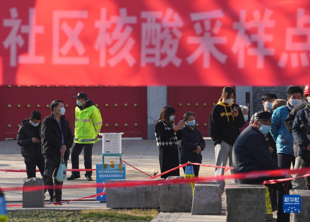 12月21日,居民在西安市开通巷社区核酸采样点排队接受核酸检测。