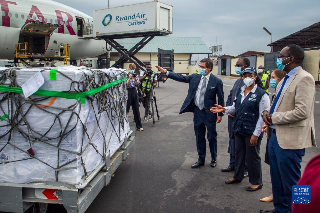 卢旺达卫生部长达尼埃尔·恩加米杰(右一)等官员在基加利国际机场查看该国首批通过COVAX计划收到的新冠疫苗(2021年3月3日)。新华社发(西里尔·恩德格亚摄)
