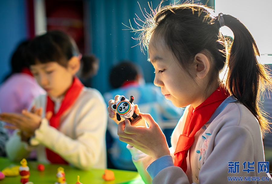 22日,呼和浩特市玉泉区恒昌店巷小学学生在用彩色黏土制作北京冬奥吉祥物“冰墩墩”。新华网发(丁根厚 摄)