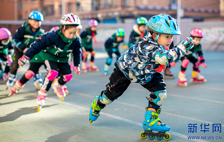 22日,呼和浩特市玉泉区恒昌店巷小学学生在练习轮滑。新华网发(丁根厚 摄)