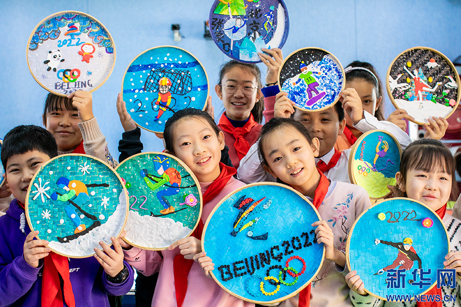22日,呼和浩特市玉泉区恒昌店巷小学学生在展示自己绘制的以冰雪运动为主题的儿童画。新华网发(丁根厚 摄)