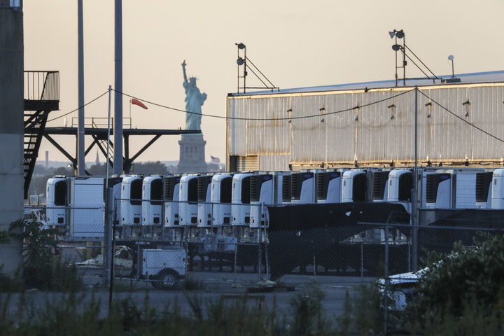 这是在美国纽约布鲁克林拍摄的一处临时停尸场内存放新冠患者遗体的冷藏车(2021年9月6日摄)。新华社记者 王迎 摄