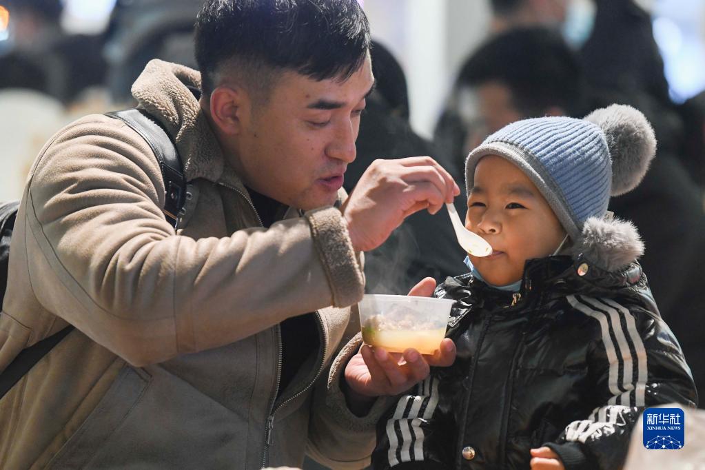 12月21日晚23时23分,在乌鲁木齐大巴扎景区,市民给孩子喂羊肉汤。