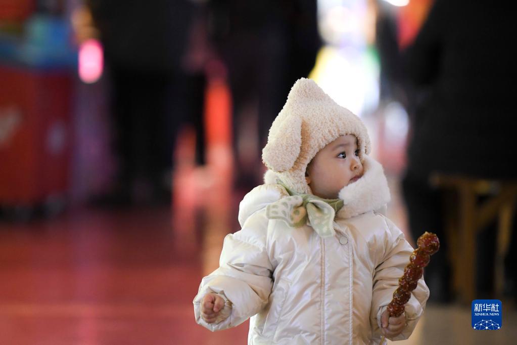 12月21日晚23时46分,一名小朋友在乌鲁木齐大巴扎景区品尝糖葫芦。