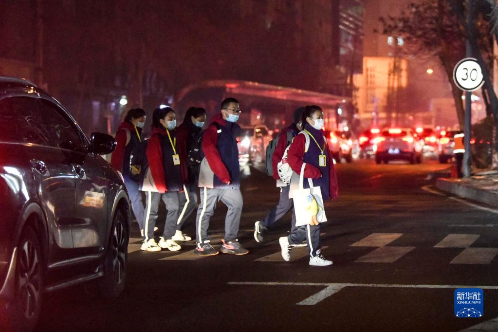 12月22日早8时52分,在乌鲁木齐市新民路上,几名上学的学生在过马路。