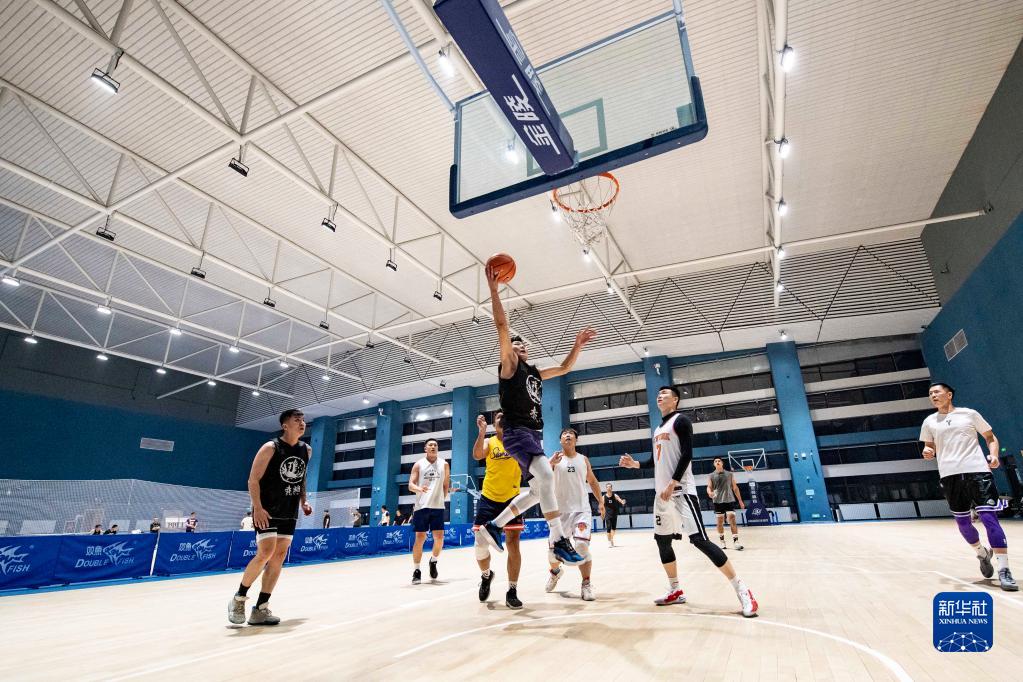 12月21日晚22时24分,23岁的巴特巴·那德木(中)在乌鲁木齐奥林匹克体育中心篮球馆打篮球。巴特巴·那德木和20多名球友组成一支名为“赤炎”的业余篮球队,每周都会一起训练或比赛。