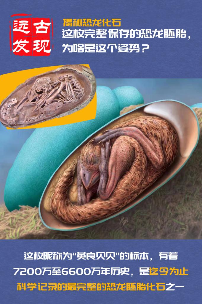 研究团队发现,“英良贝贝”的保存姿势在已知的恐龙胚胎中是独一无二的,其头部位于身体下方,脚在两侧,身体背部沿着蛋的钝端蜷缩着。这种姿势与现代鸟类的胚胎类似,而在以前的恐龙胚胎化石中从来没有发现过这种情况。