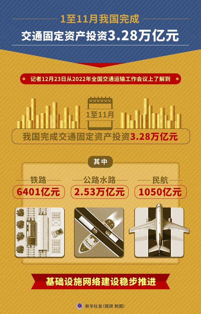 新华社北京12月23日电(记者叶昊鸣)记者23日从2022年全国交通运输工作会议上了解到,1至11月,我国完成交通固定资产投资3.28万亿元,其中铁路6401亿元、公路水路2.53万亿元、民航1050亿元,基础设施网络建设稳步推进。