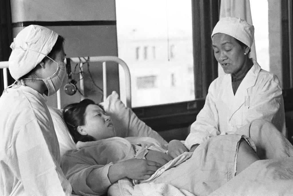 这是1956年林巧稚大夫(右)在北京协和医院妇产科病房为病人做检查。新华社发