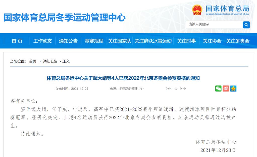 新华社哈尔滨12月23日电(记者王君宝、刘阳)国家体育总局冬季运动管理中心23日发布通知称,鉴于武大靖、任子威、宁忠岩、高亭宇已获2021-2022赛季短道速滑、速度滑冰项目世界杯分站赛冠军,经研究决定,上述四名运动员获得2022年北京冬奥会参赛资格,其余运动员需通过选拔产生。