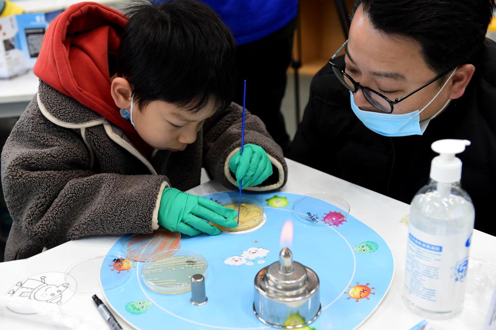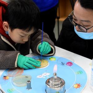 12月11日,在安徽省科技馆,小朋友在家长的陪同下制作微生物艺术画。(新华社记者 黄博涵 摄)