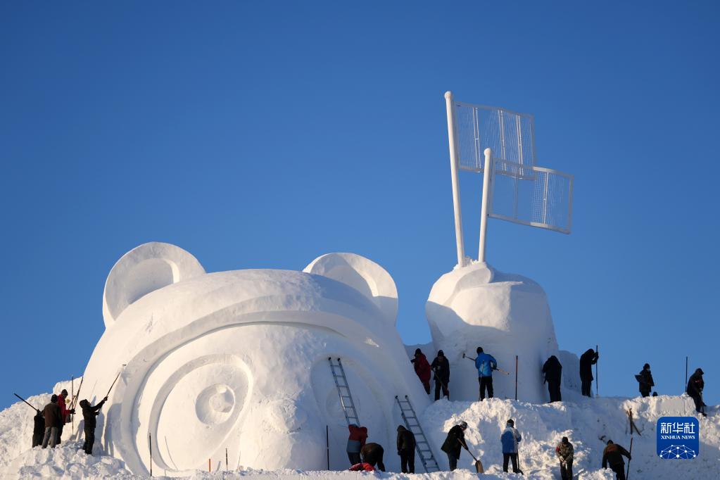 12月24日,在太阳岛雪博会园区,雪雕师在进行雪雕创作。