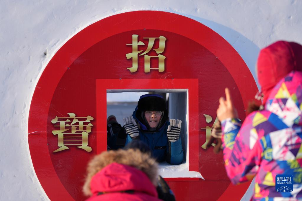 12月24日,在太阳岛雪博会园区,游客在一处体验式雪景中游玩拍照。