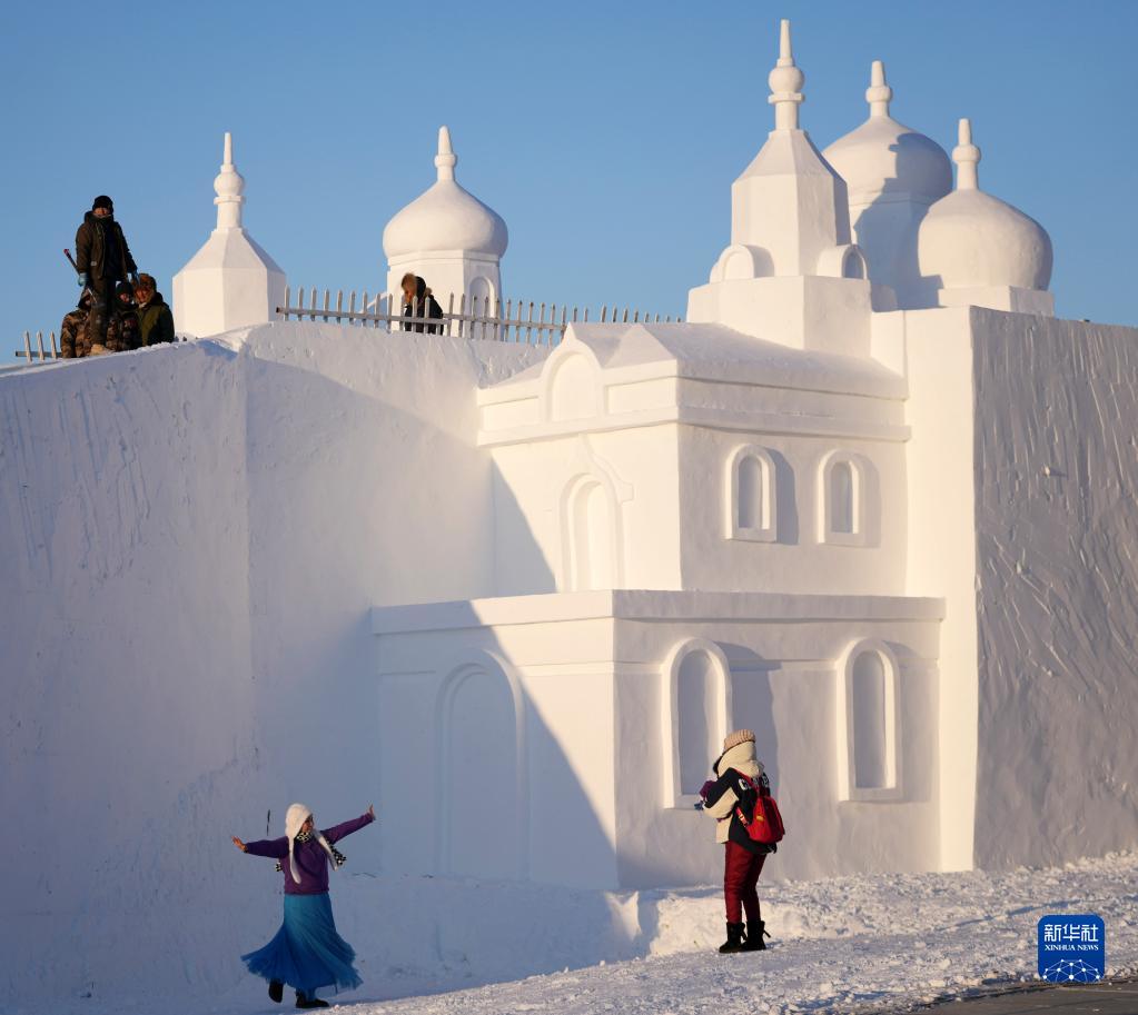 12月24日,在太阳岛雪博会园区,游客在雪雕前留影。
