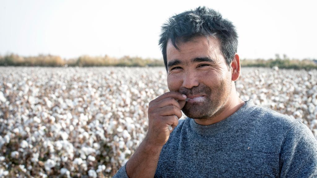 “棉花捕手”艾买尔·艾则孜在新疆沙雅县盖孜库木乡自家的棉田里,摘下一朵棉花含在嘴里(10月25日摄)。艾买尔·艾则孜家住新疆阿克苏地区沙雅县,这里是新疆的重要棉花产区。随着机械化种棉的推广,艾买尔·艾则孜家棉花的翻地播种、施肥打药、采收售卖基本都由机器完成,效率和收入明显提升。(新华社记者马锴 摄)