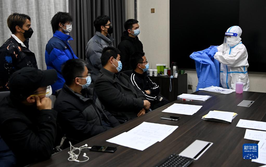 12月24日,在西安外国语大学,医务人员为即将前往隔离酒店送考上门的师生讲解防护服穿脱的注意事项。