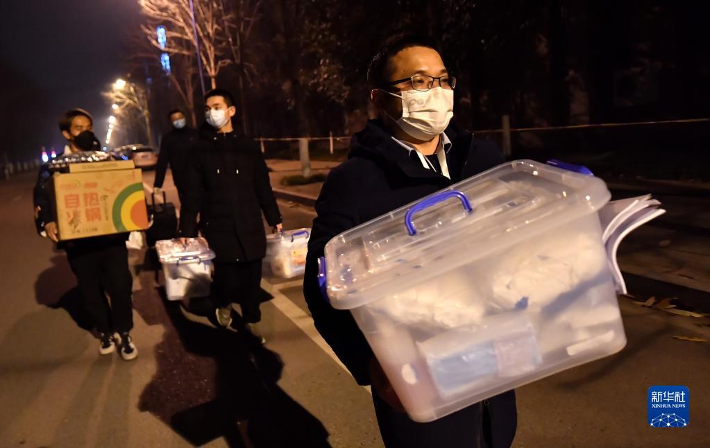 12月24日,在西安外国语大学,前往隔离酒店的师生搬运即将携带到隔离酒店考点的防疫和考试物资。