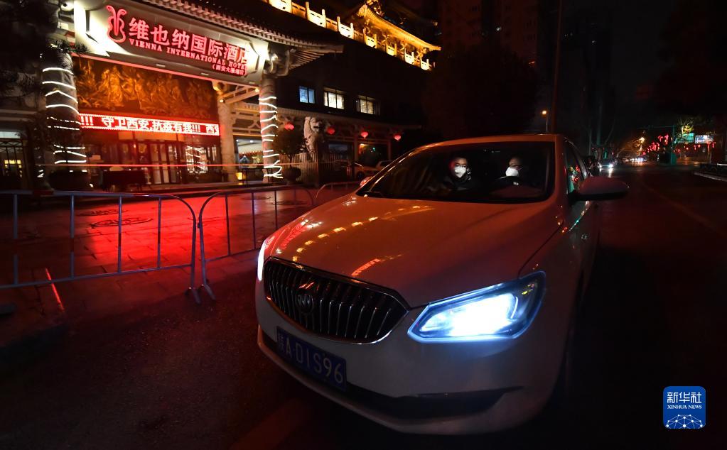 12月25日凌晨,前往隔离酒店送考上门的西安外国语大学老师抵达集中隔离酒店。