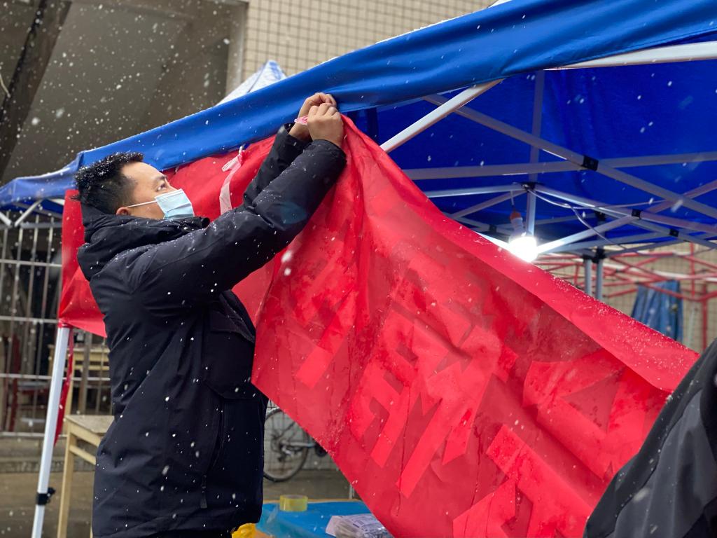12月25日上午,西安市中级人民法院执行局法官牛晶琦在西安市雁塔区长延堡街道航天六院社区布置核酸检测现场。(受访者供图)