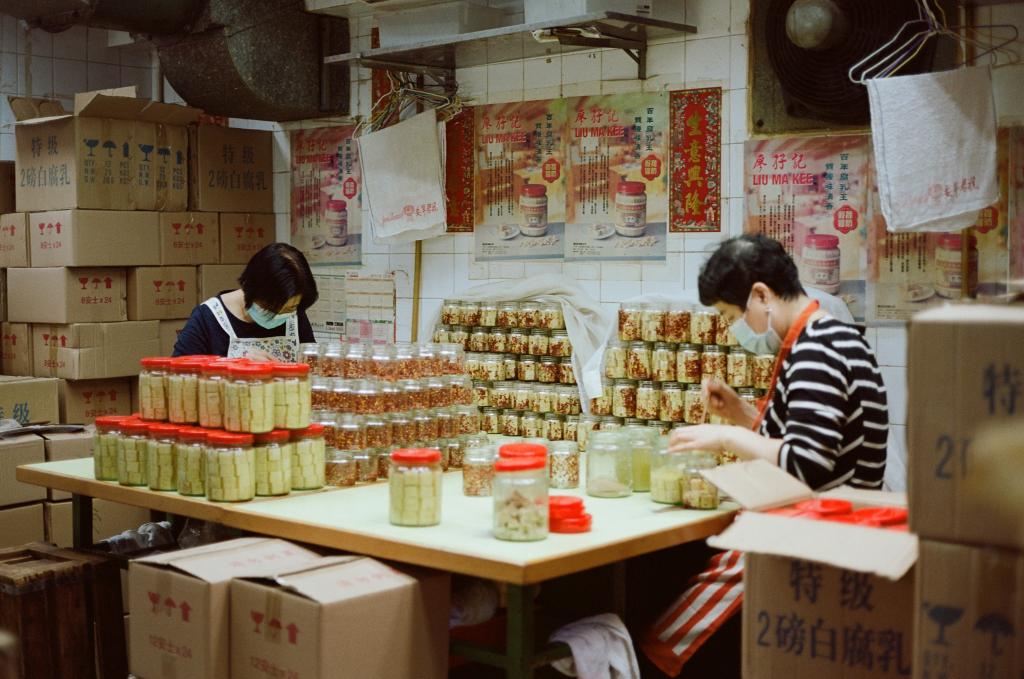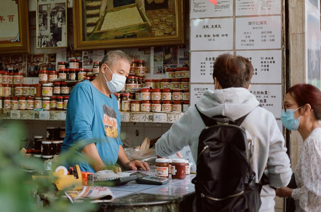 走进店内,腐乳的味道扑面而来。店铺约四十几平方米,呈狭长布局,前台货架上摆放着腐乳和其他酱料。穿过一道门,后面是制作和包装产品的作坊,廖家雇用了两位工人,负责将腐乳块和酱料装进透明玻璃罐。
