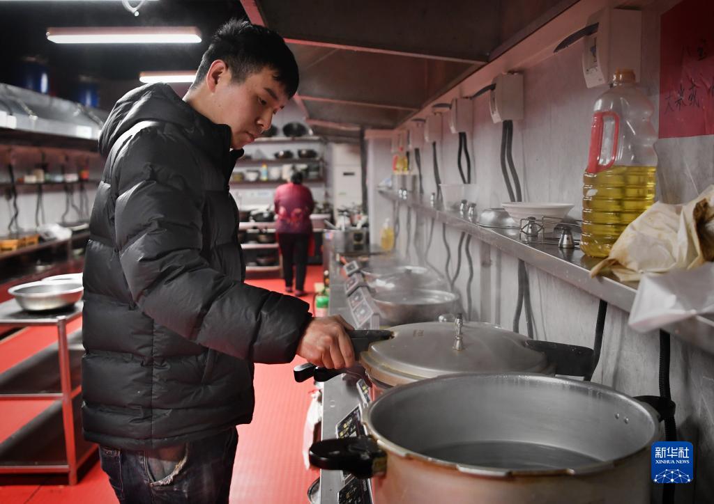 张广兵在共享厨房里使用高压锅熬制用于免费赠送的八宝粥(12月14日摄)。