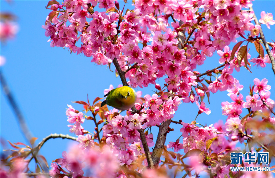 云南省弥勒市城区,樱花争相绽放,鸟儿在枝头嬉戏(12月22日摄)。新华网发(普佳勇 摄)