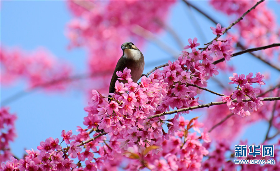 云南省弥勒市城区,樱花争相绽放,鸟儿在枝头嬉戏(12月22日摄)。新华网发(普佳勇 摄)
