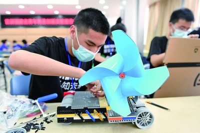 第七届全国青年科普创新实验暨作品大赛福建赛区复赛、首届福建省青年科普创新实验暨作品大赛上,选手在制作风力装置。新华社发