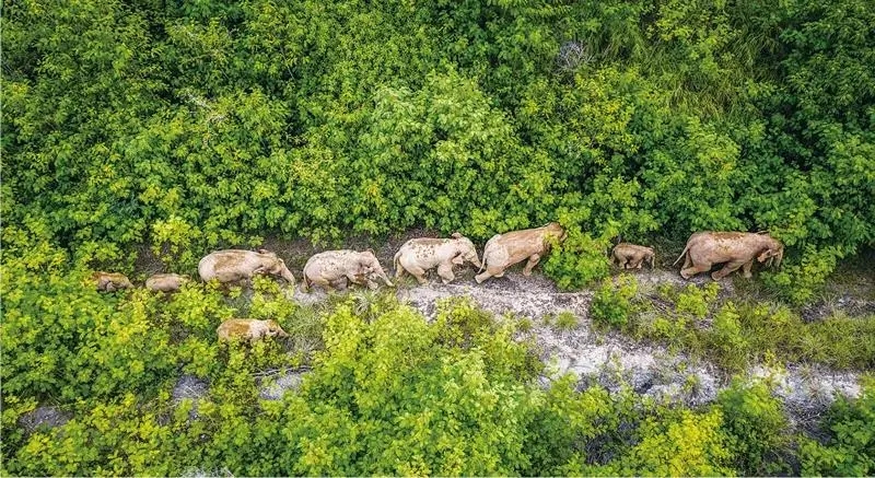 原本栖息在云南省西双版纳傣族自治州境内的一群野生亚洲象北上及返回之旅,引发全球关注。中国政府与民众携手护象的行动得到世界点赞。图为2021年8月9日在云南省玉溪市元江县境内拍摄的象群(无人机照片)。新华社记者 胡超/摄
