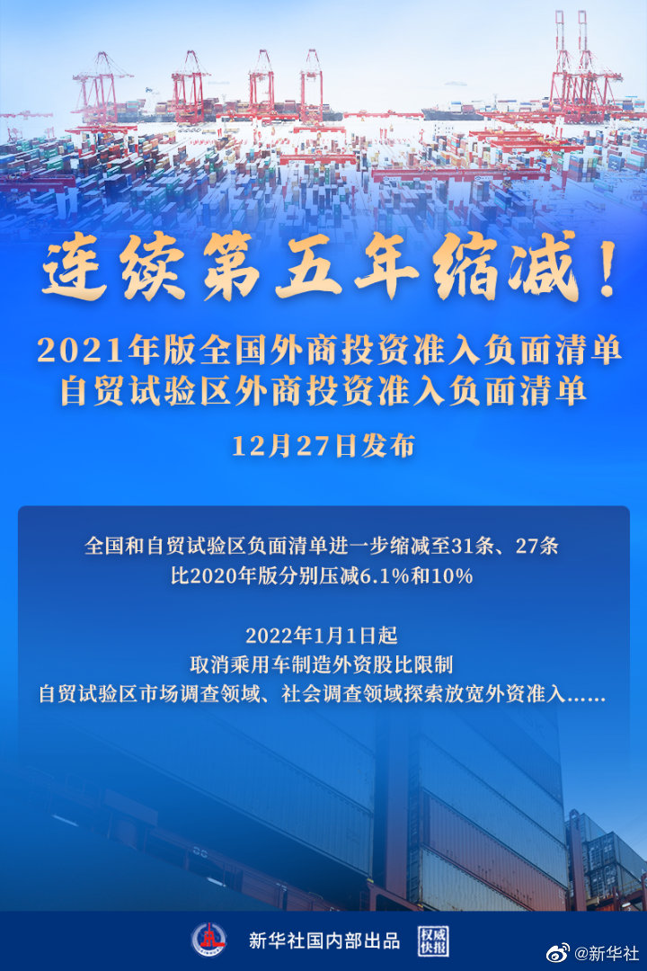2022年1月1日起,我国将取消乘用车制造外资股比限制以及同一家外商可在国内建立两家及两家以下生产同类整车产品的合资企业的限制;取消外商投资卫星电视广播地面接收设施及关键件生产的限制。自贸试验区市场调查及社会调查领域探索放宽外资准入。国家发展改革委、商务部27日发布《外商投资准入特别管理措施(负面清单)(2021年版)》和《自由贸易试验区外商投资准入特别管理措施(负面清单)(2021年版)》。2021年版全国和自贸试验区外资准入负面清单进一步缩减至31条、27条,压减比例分别为6.1%、10%。(记者安蓓、谢希瑶,海报设计:杨轶群)
