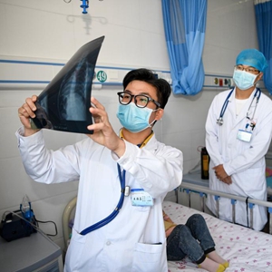 来自福建省泉州市第一医院的医生(左一)与宁夏吴忠市同心县人民医院医生交流患者病情(2020年9月18日摄)。新华社记者 王鹏 摄