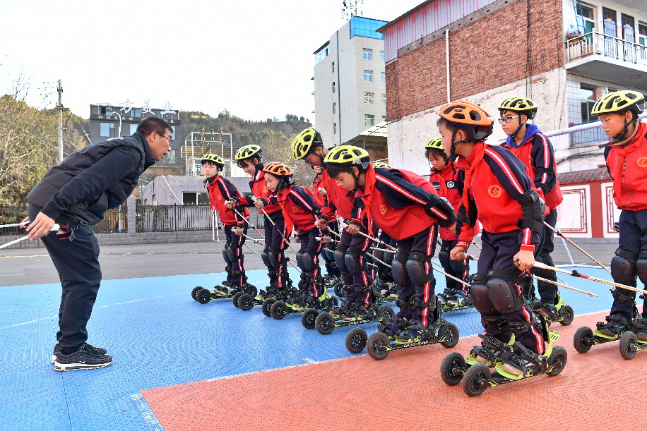 在山西省吕梁市城东小学操场上,20多名学生脚踩滑轮、手杖撑地,飞驰在跑道上,寒冷的天气丝毫没有影响他们运动的热情。