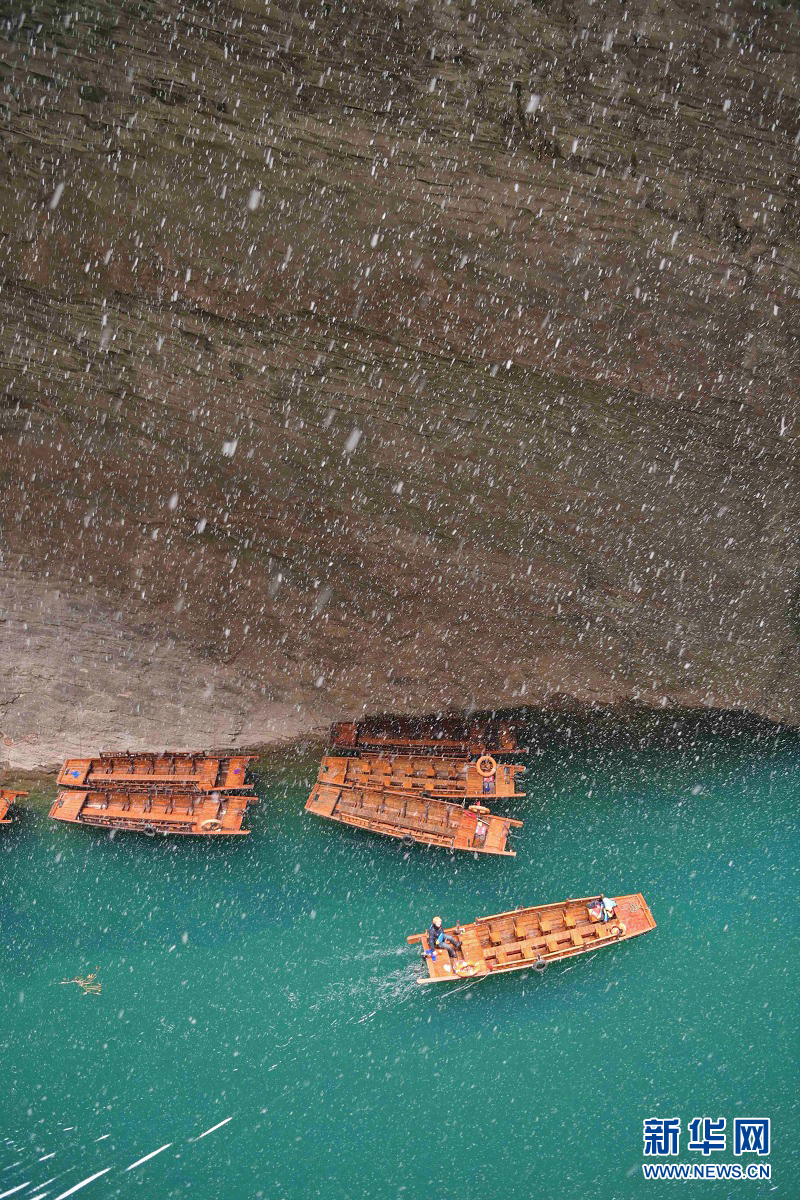 图为12月27日,游船经过湖北省鹤峰县容美镇屏山村屏山峡谷。新华网发 杨顺丕摄