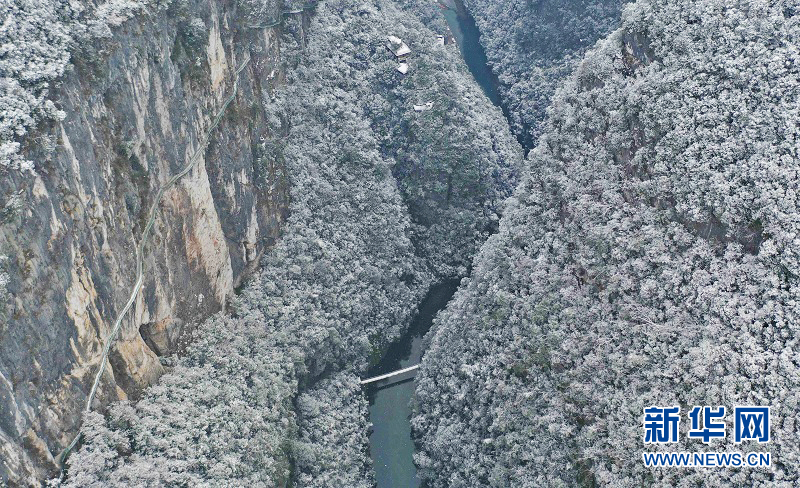图为12月27日航拍的湖北省鹤峰县容美镇屏山村屏山峡谷雪景。新华网发 陈明斌摄