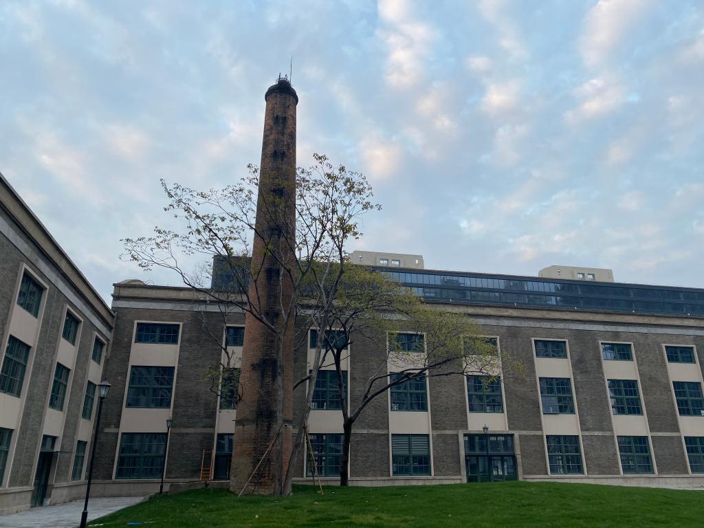 图为老厂房原有的青砖墙面和厂房旁的烟囱被保留下来。 新华社记者吴帅帅 摄
